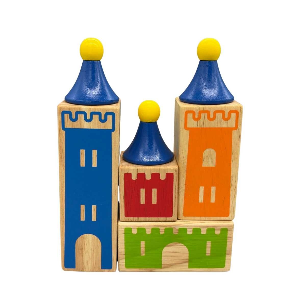 Ett pusselspel där utmaningen är att sätta ihop träklossarna och tornen för att bygga ett av slotten i det medföljande utmaningshäftet.