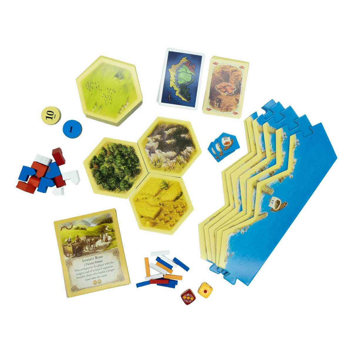Settlers of Catan grundspel är ett älskat brädspel där spelarna tävlar om att kolonisera ön Catan genom att samla och byta resurser. Det modulära spelbrädet gör varje omgång unik.