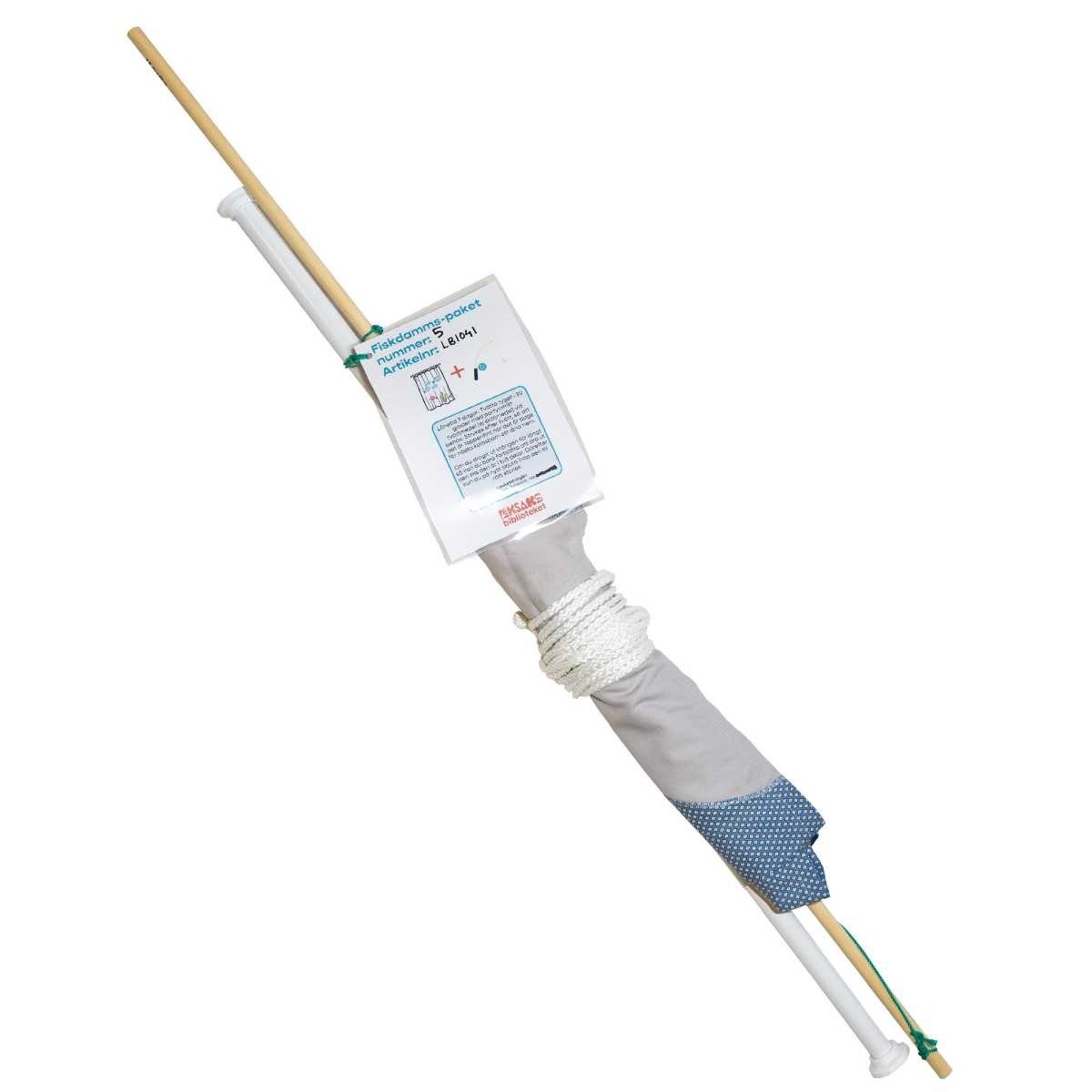 Fiskdammspaket nummer 5 innehåller ett fiskdammsskynke i blått och grått, med påsydda fiskar, och sjögräs i olika färger. Fiskespöt är gjort av rundstav, rep och en klädnypa. Med paketet kommer också ett vitt rep och en duschdraperistång. Det är inte tillåtet att göra hål i tyget.
