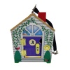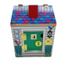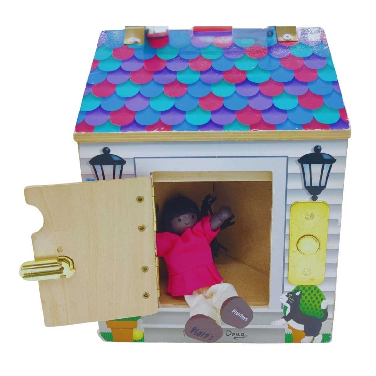 Trähus med dörrklocka och olika lås. Denna välbyggda trästuga har fyra elektroniska dörrklockor, fyra unika lås med matchande nycklar och fyra små dockor med böjbara ben och armar. Nycklarna är knutna till huset så att de inte ska försvinna och tack vare det stabila handtaget kan barnet enkelt bära med sig sitt hus.