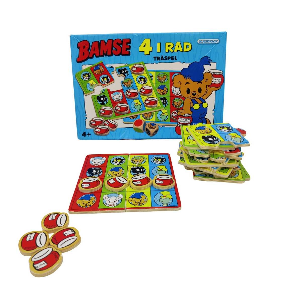 Bamses 4 i rad är ett roligt och enkelt barnspel med Bamse och hans vänner. Det gäller att lägga ut honungsburkar på sin spelplan och så snabbt som möjligt försöka få 4 stycken i rad. Bildtärningen och färgtärningen kastas samtidigt och avgör var på spelplanen du får lägga en honungsburk. Den som först lyckas få 4 honungsburkar i rad har vunnit.