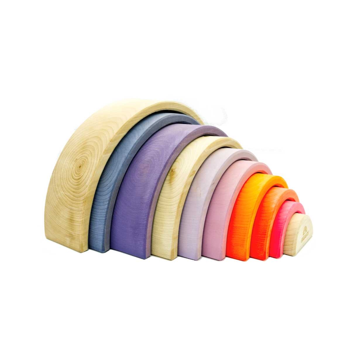 Stapelklossar med tio delar i fina färger. Stapla regnbågsblocken till en klassisk regnbåge, eller låt fantasin flöda och förvandla dem till tunnlar för bilar, rundade banor för bollar eller djurskulpturer.