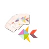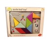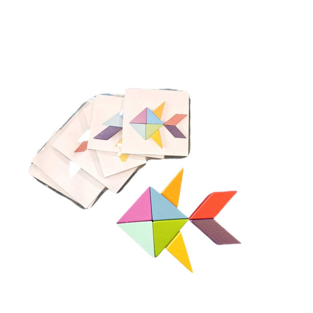 Åtta träklossar med magneter, som kan staplas högt och man kan bygga olika figurer med hjälp av magnetkraften. Glada färger och geometriska former. Kommer i en tygpåse.