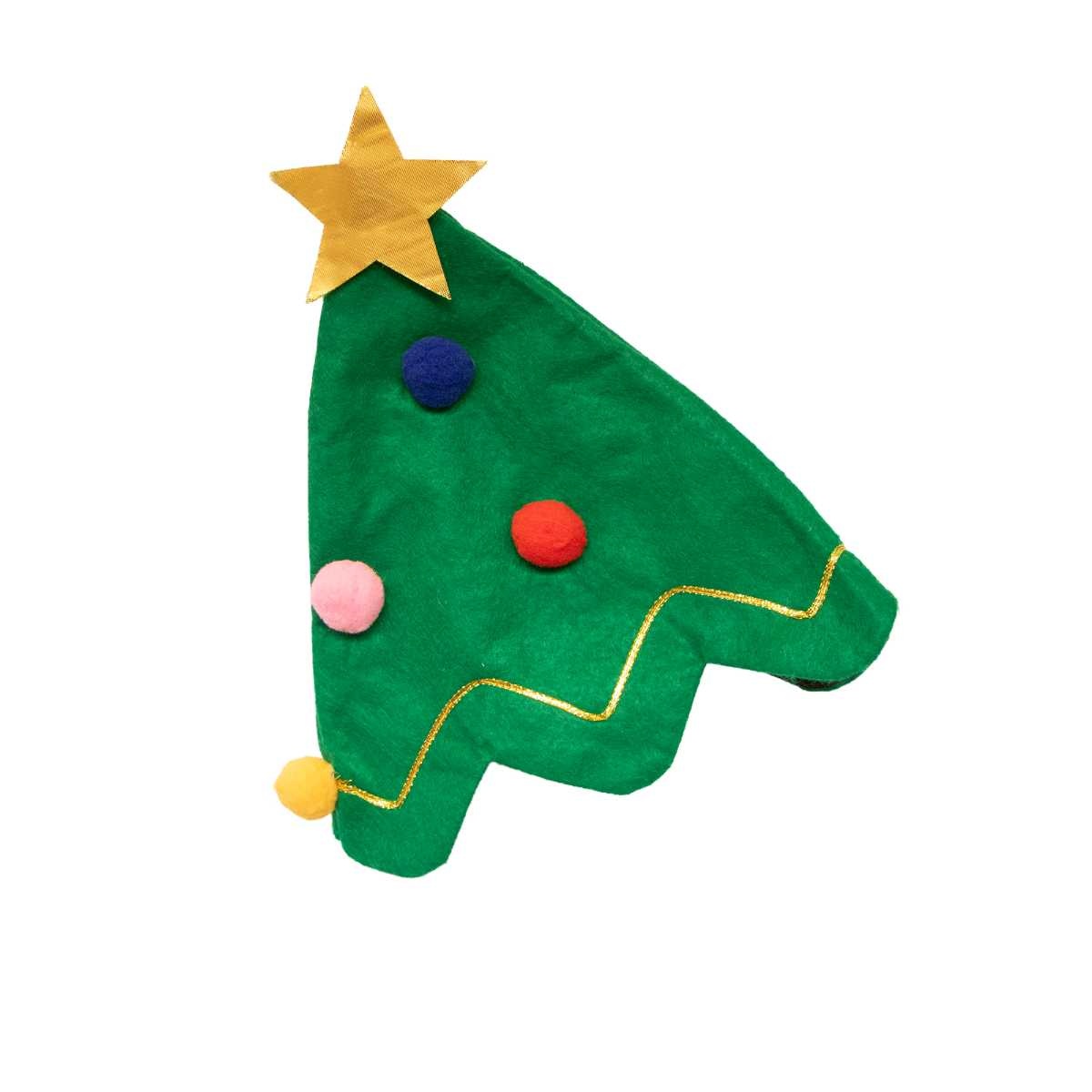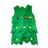 Här har vi en fantastiskt vacker julgransdräkt! Den kommer i två delar och har en filttextur. Den större grandelen träs över barnets huvud och går att knäppa med kardborre bak i nacken. På framsidan av granen finns kulörta bollar som påminner om en ljusslinga. Runt hela granen går en gulglittrig tråd. Hatten har samma utsmyckning som den större grandelen plus att den är pyntad med en stjärna längst upp i toppen.