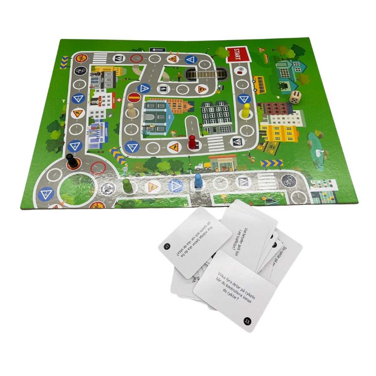 I detta underhållande och pedagogiska brädspel för hela familjen handlar det om att få barnen säkert till skolan. På vägen finns det många olika frågor och vägmärken, som inbjuder till samtal om trafiksäkerhet. Lär ditt barn om trafikregler, barnet b.la. lär sig om betydelsen av vägskyltar, trafik i trafiken och trafiksäkerhet. För att vinna spelet måste du vara den första som når skolan säkert.