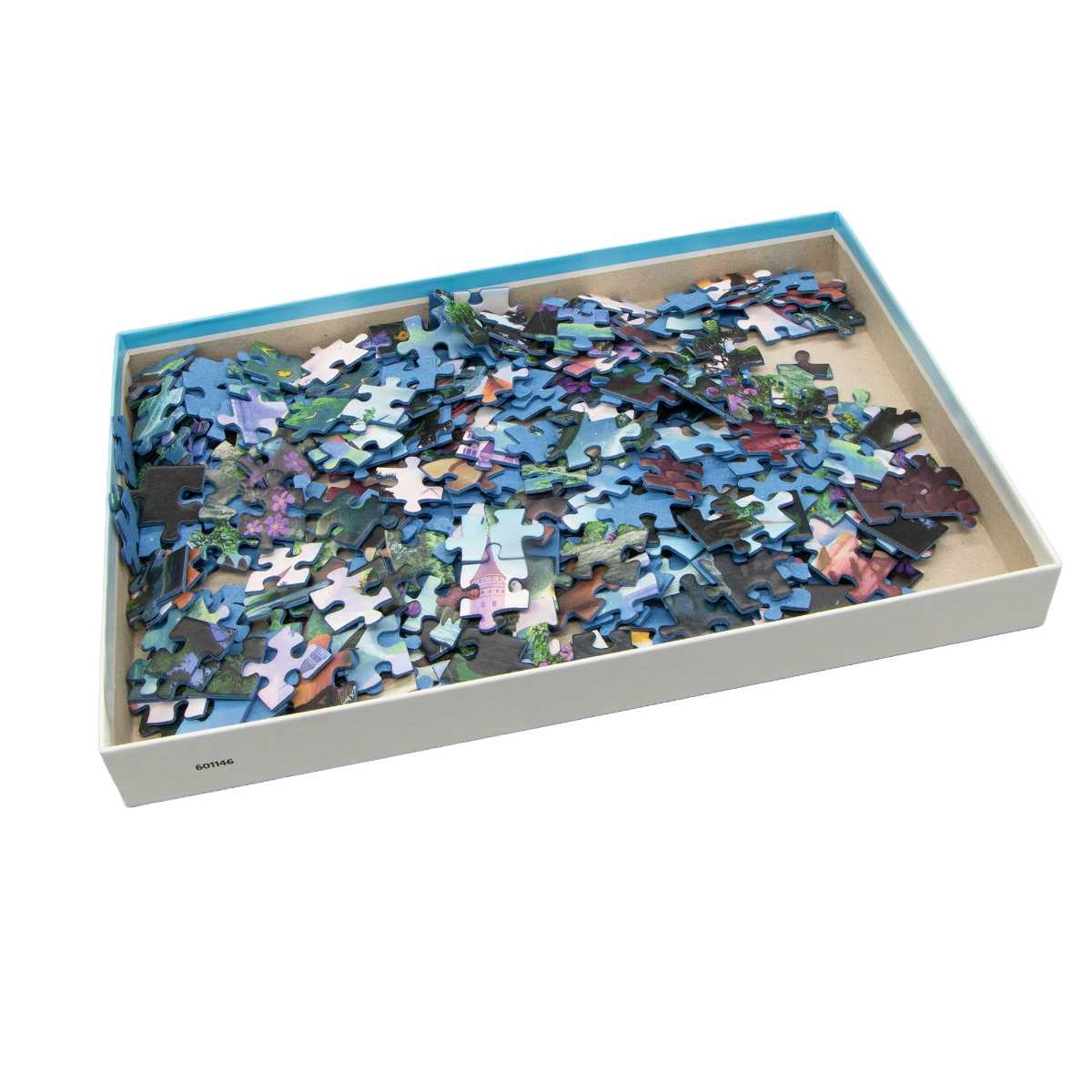 Ett pussel med 300 bitar med motiv av drakar och slott.