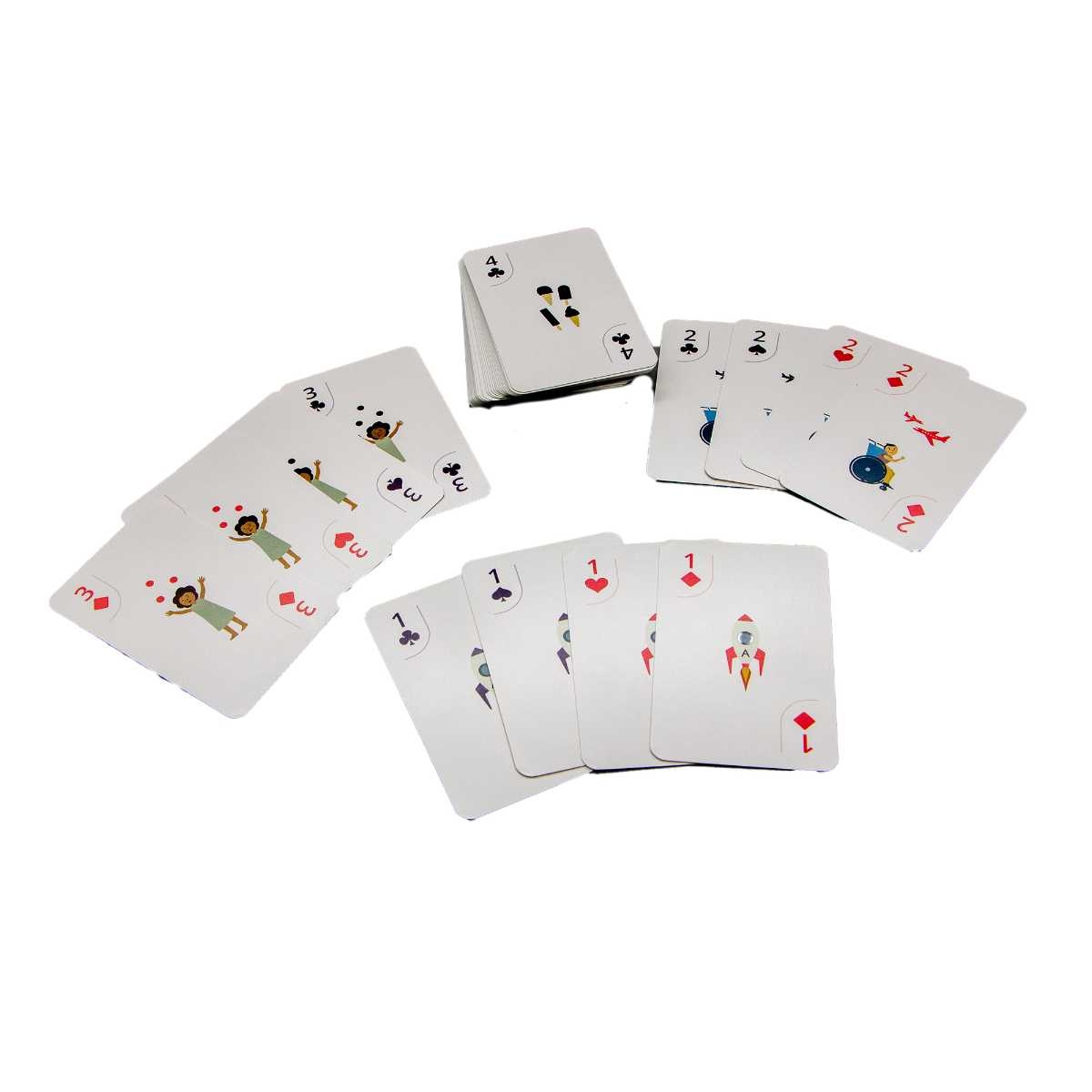 En klassisk kortlek för barn med en liten twist. Kortleken är anpassad så att alla kort ska bli lättare att förstå för barn, samtidigt går kortleken användas för alla kortspel. Matematiska tecken finns med för att att kunna lägga till matteelement till era familjefavoriter, och skapa nya roliga mattelekar tillsammans.