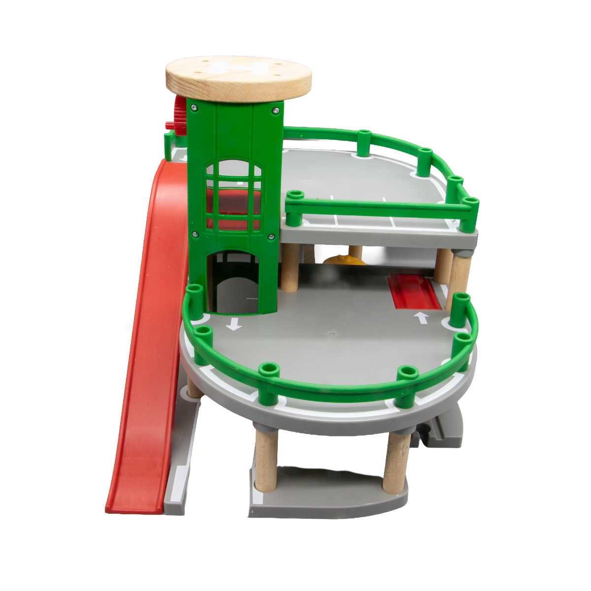 BRIO Parkeringshus är ett flervåningshus: kör upp, parkera, kör ner via rampen. Tanka på plan 1 eller placera bilen på rampen på plan 2, tryck på knappen så hamnar bilen på biltransportvagnen. Kopplas enkelt till BRIO-tåg- och bilbanor.