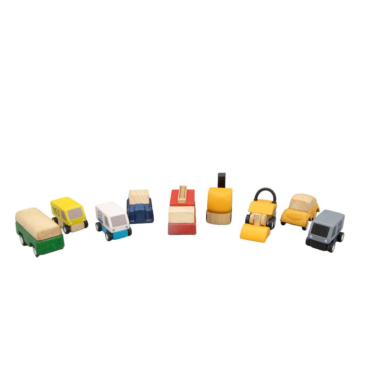 Ett set med 10 härliga bilar med skönt rull. En brandbil, en buss och två vanliga bila, 3 stycken budbilar och 3 arbetsfordon. Ca 5-7 cm långa.