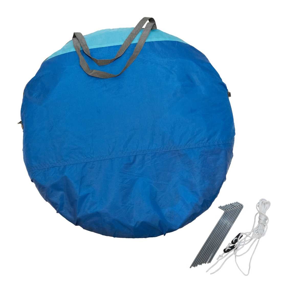 Strandtält som fälls upp på bara några sekunder. Packa upp och kasta så viker tältet ut sig av sig självt. Vind- och solskydd. Av slitstarkt och vattenavvisande polyesterväv. Lätt och stabil glasfiberstomme. och 4 sandfickor för extra stabilitet.