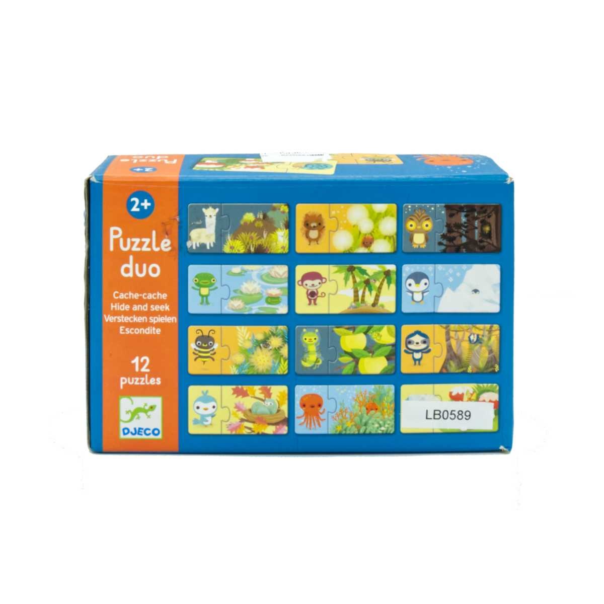 11 pussel med två bitar i varje pussel. Bilderna är på olika djur som leker kurragömma på ena bilden.