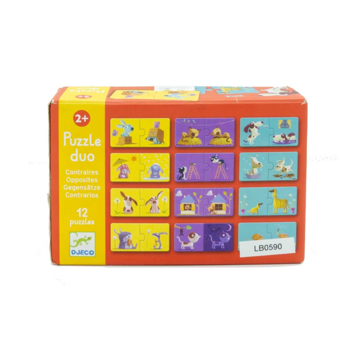 12 pussel med två bitar i varje pussel. Bilderna är på olika djur och när de gör motsatta saker. Ett djur är smutsigt på ena pusselbiten och på den matchande så badar det.
