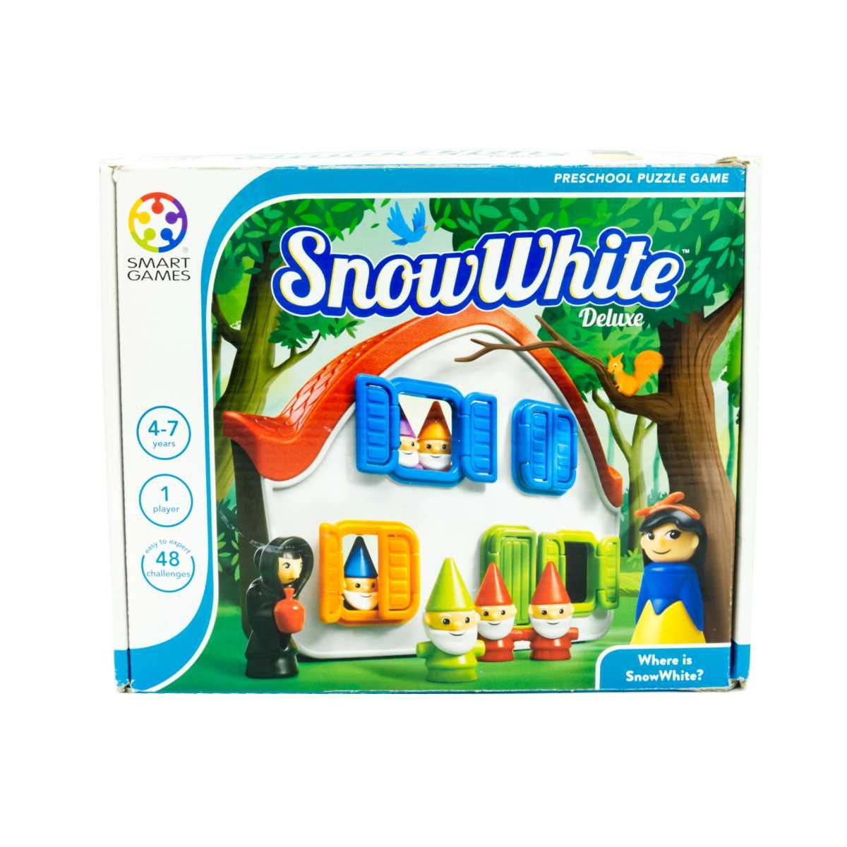 När spelarna klarat av en utmaning kan de öppna alla dörrar och dra upp alla persienner och jämföra sin placering med den rätta lösningen. Passa också på att läsa sagan om Snövit och de sju dvärgarna i den medföljande bilderboken (utan text).