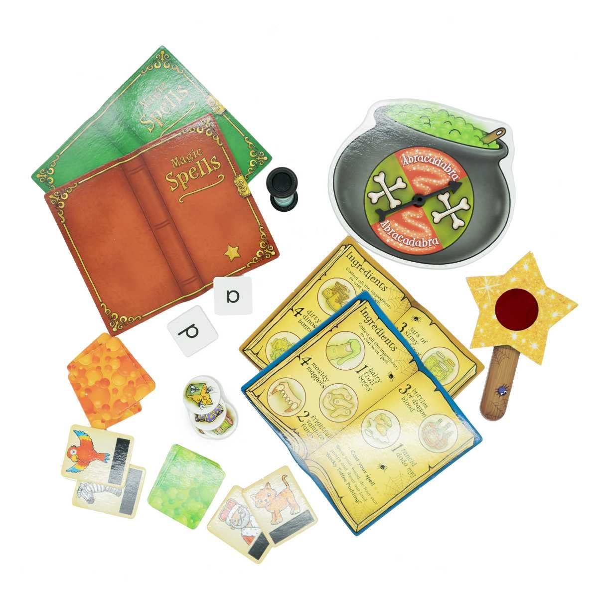 Abrakadabra! Skynda dig att hitta alla bokstäver för att stava ditt ord med hjälp av den magiska trollstaven! Gnugga kortet för att magiskt avslöja den rätta stavningen och försök att komma först med att fylla din stavningsbok med alla läskigt äckliga ingredienser!